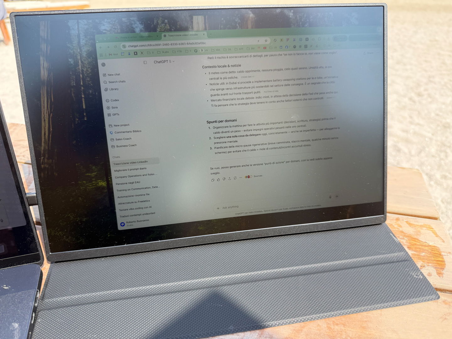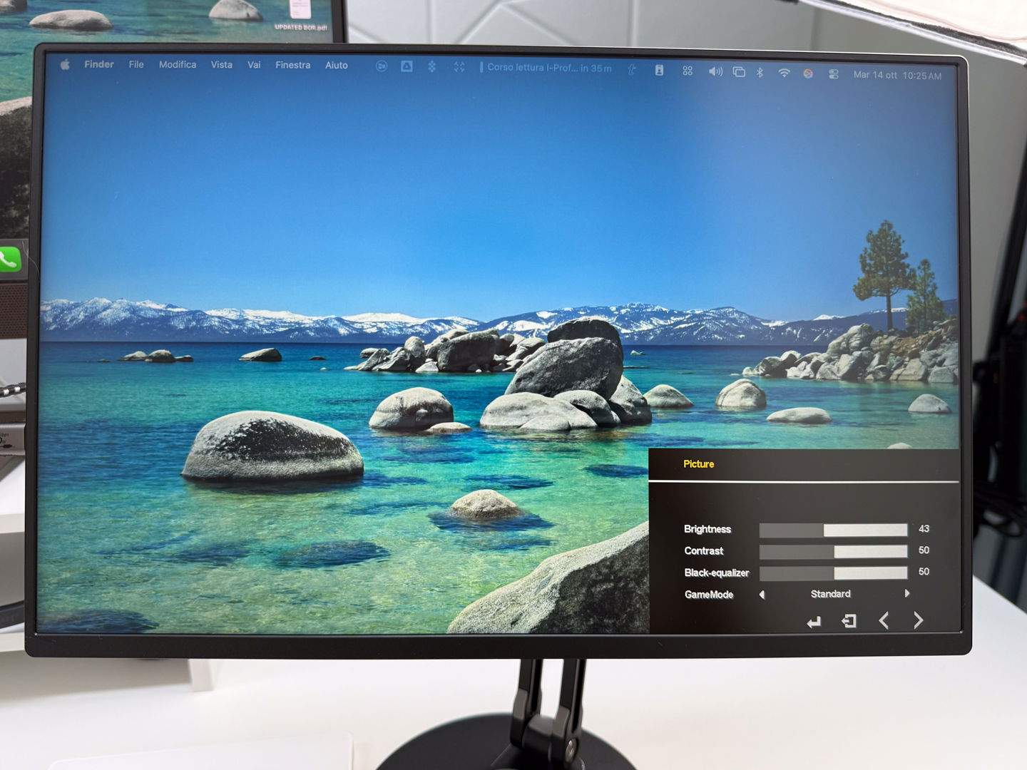 Come detto la caratteristica di punta di questo UPERFECT UColor T6 è la luminosità massima, che raggiunge i 1.200 nits (cd/m²). È promosso come un monitor usabile all'aperto e leggibile alla luce solare, e nei nostri test mantiene questa promessa. Chiaramente, sotto il sole diretto di un mezzogiorno estivo lo schermo rimane impegnativo da leggere, ma in qualsiasi condizione meno estrema è sempre usabile. Per questo lo consigliamo soprattutto a chiunque faccia molta attività all’aria aperta, come fotografi e videomaker per esempio, che avranno un monitor per verificare le proprie riprese e gestire rapidi fotoritocchi o montaggi video, facile da usare e altamente visibile ovunque. Aiuta anche la presenza di altoparlanti integrati, più che sufficienti per verificare l’audio delle proprie registrazioni. Nella nostra prova all’aperto più impegnativa, collegato a un Macbook Pro M3 16”, sotto il sole inesorabile di Dubai a mezzogiorno. Lo schermo, nonostante funzionasse senza l’alimentazione aggiuntiva che garantisce il massimo dei nits, era visibile, al pari di quello del Macbook impostato alla massima luminosità.
