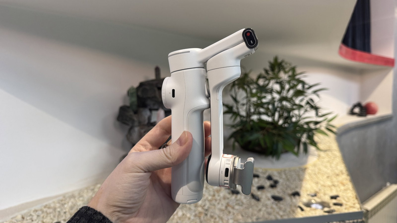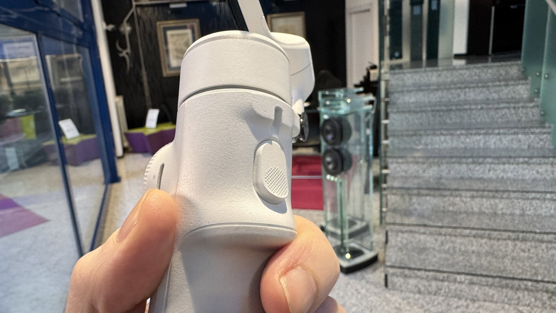 Il gimbal è costruito in alluminio e plastica rigida con finiture che trasmettono solidità. Il braccio anteriore ha una finitura trasparente che consente di vedere l'interno del meccanismo, una scelta estetica che non compromette la durabilità ma aggiunge un appeal visivo. La parte posteriore del braccio integra un anello luminoso LED che s'illumina in verde quando il tracciamento AI è attivo, permettendo di verificare a distanza se la funzione è operativa. Questo dettaglio si rivela particolarmente utile quando si registrano contenuti senza avere costantemente sotto controllo lo schermo del telefono.