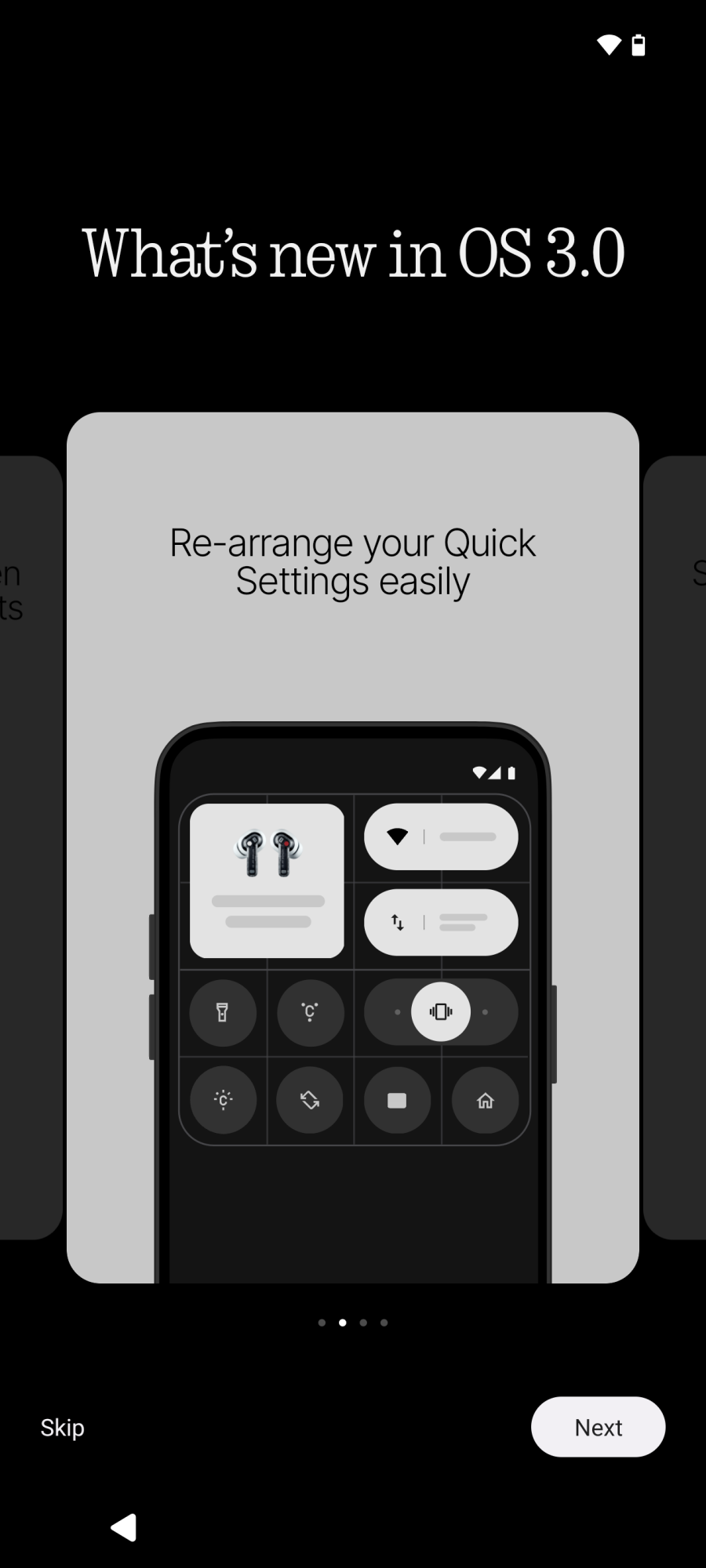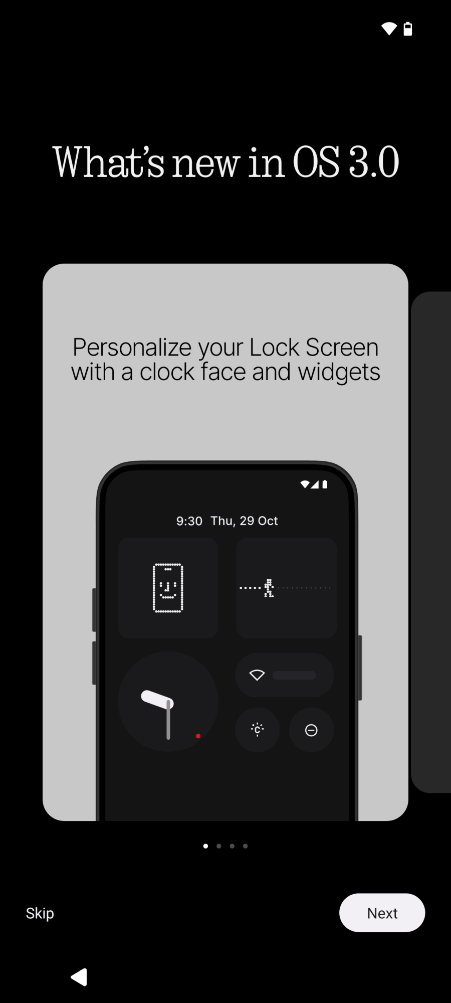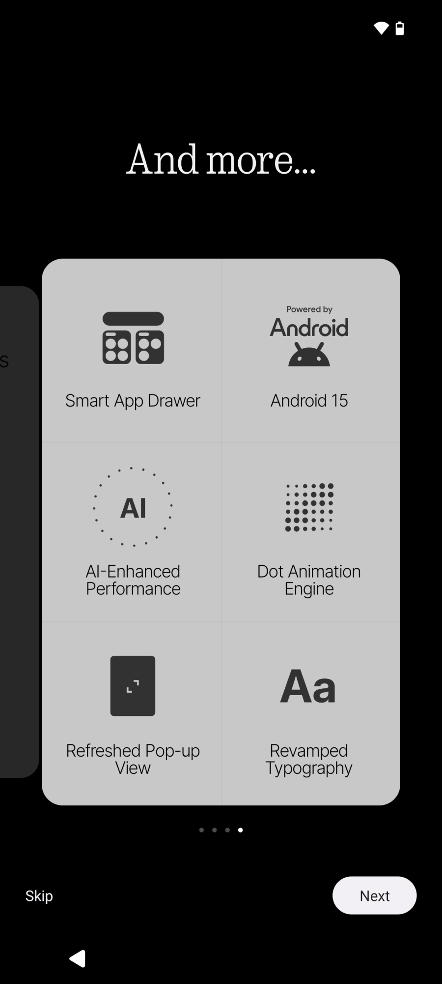 Nothing OS si distingue per la sua natura leggera, quasi interamente priva di bloatware e super facile da personalizzare. La sua estetica minimalista e distintiva si riflette in ogni elemento dell'interfaccia utente, con il suo stile monocromatico, il design delle icone semplice e l'ampia collezione di widget, che donano un senso di vitalità alla schermata iniziale. Il design è tematicamente coerente con l'hardware, creando un'esperienza unificata.