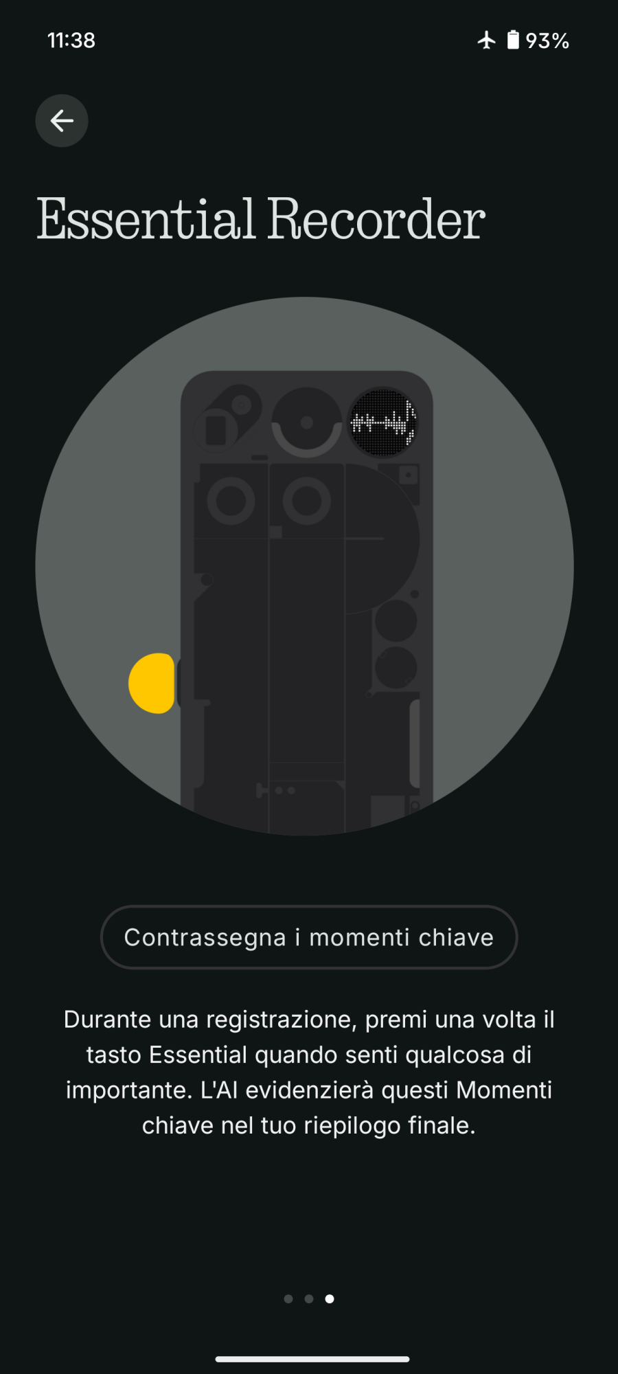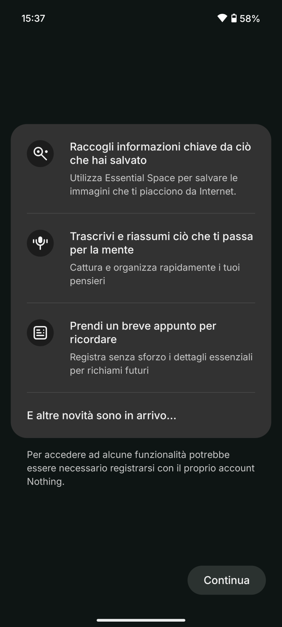 Il concetto di Essential Space, introdotto con la serie (3a), rimane una caratteristica centrale. Si tratta di una sorta di bacheca digitale in cui è possibile salvare screenshot, registrare promemoria vocali o catturare informazioni visive o audio dal mondo circostante. Questi elementi vengono poi analizzati e riassunti dall'AI per facilitare la ricerca futura. L'accesso rapido a questa funzione avviene tramite la Essential Key dedicata sul lato del telefono. La Essential Key, pur essendo un tentativo lodevole di Nothing di innovare, può risultare fastidiosa a causa delle pressioni accidentali e dell'impossibilità di disattivarla o rimapparla.
