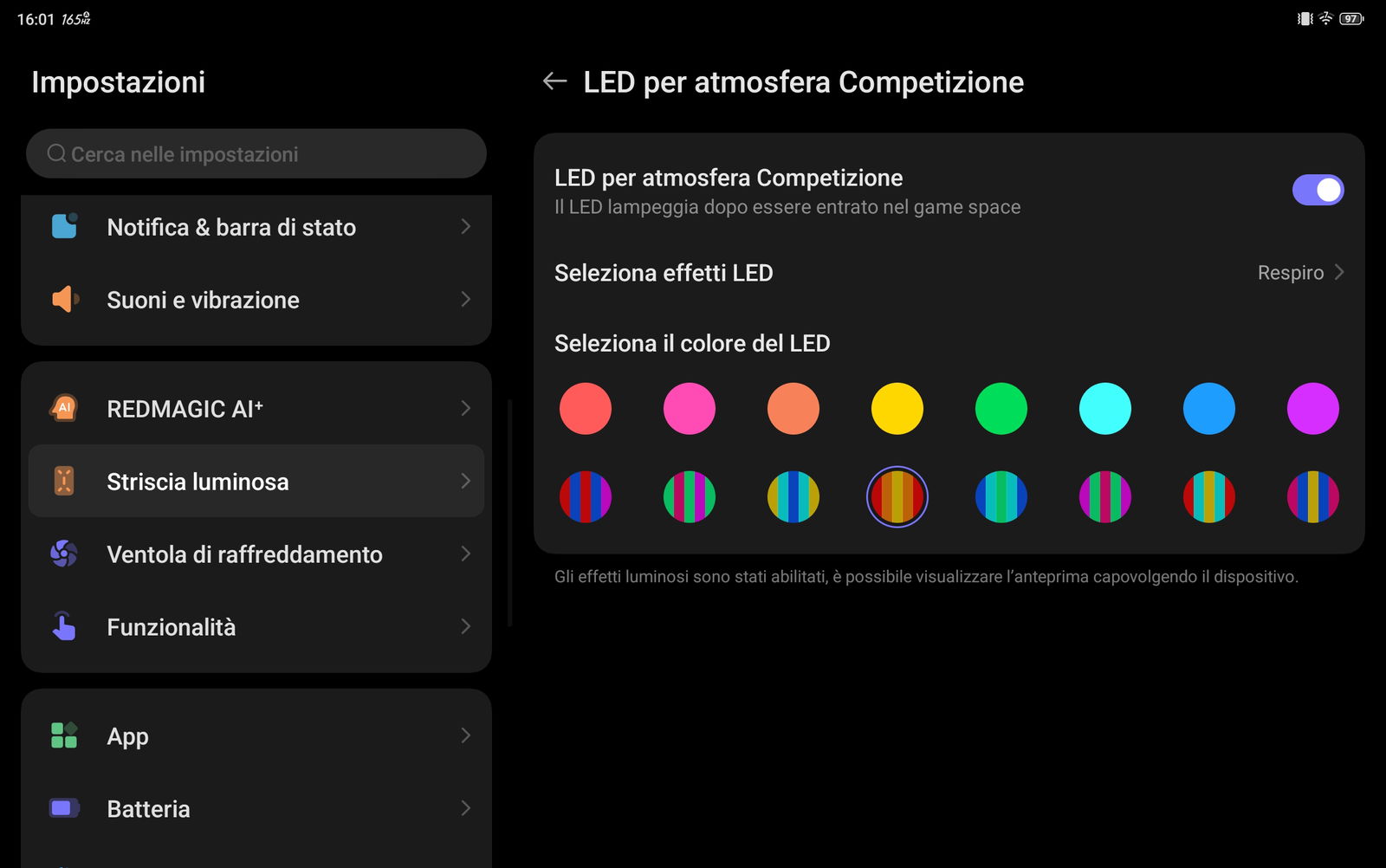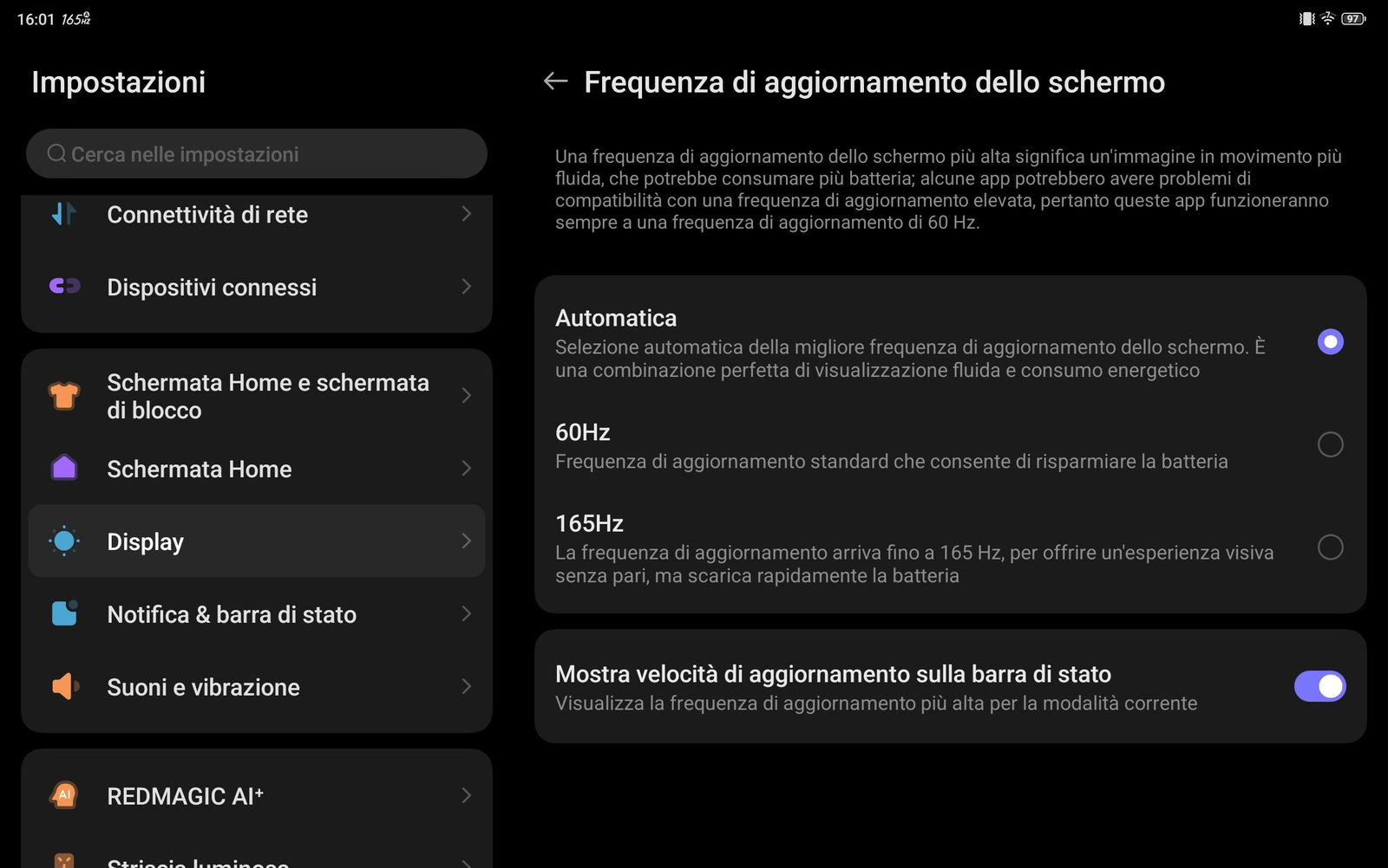 Il display è, senza mezzi termini, il fiore all'occhiello del RedMagic Astra, l'elemento che più di ogni altro lo eleva al di sopra della concorrenza nel suo segmento di mercato. In un panorama dominato da pannelli LCD IPS, la scelta di RedMagic di implementare uno schermo OLED da 9,06 pollici è una mossa coraggiosa e vincente. I vantaggi di questa tecnologia sono immediatamente percepibili sin dalla prima accensione: i neri sono assoluti, perfetti, non grigi scuri come negli LCD, e questo conferisce a ogni immagine un contrasto praticamente infinito. I colori sono vividi, saturi al punto giusto, ma mai innaturali, grazie anche a un'eccellente calibrazione di fabbrica che garantisce una notevole fedeltà cromatica.