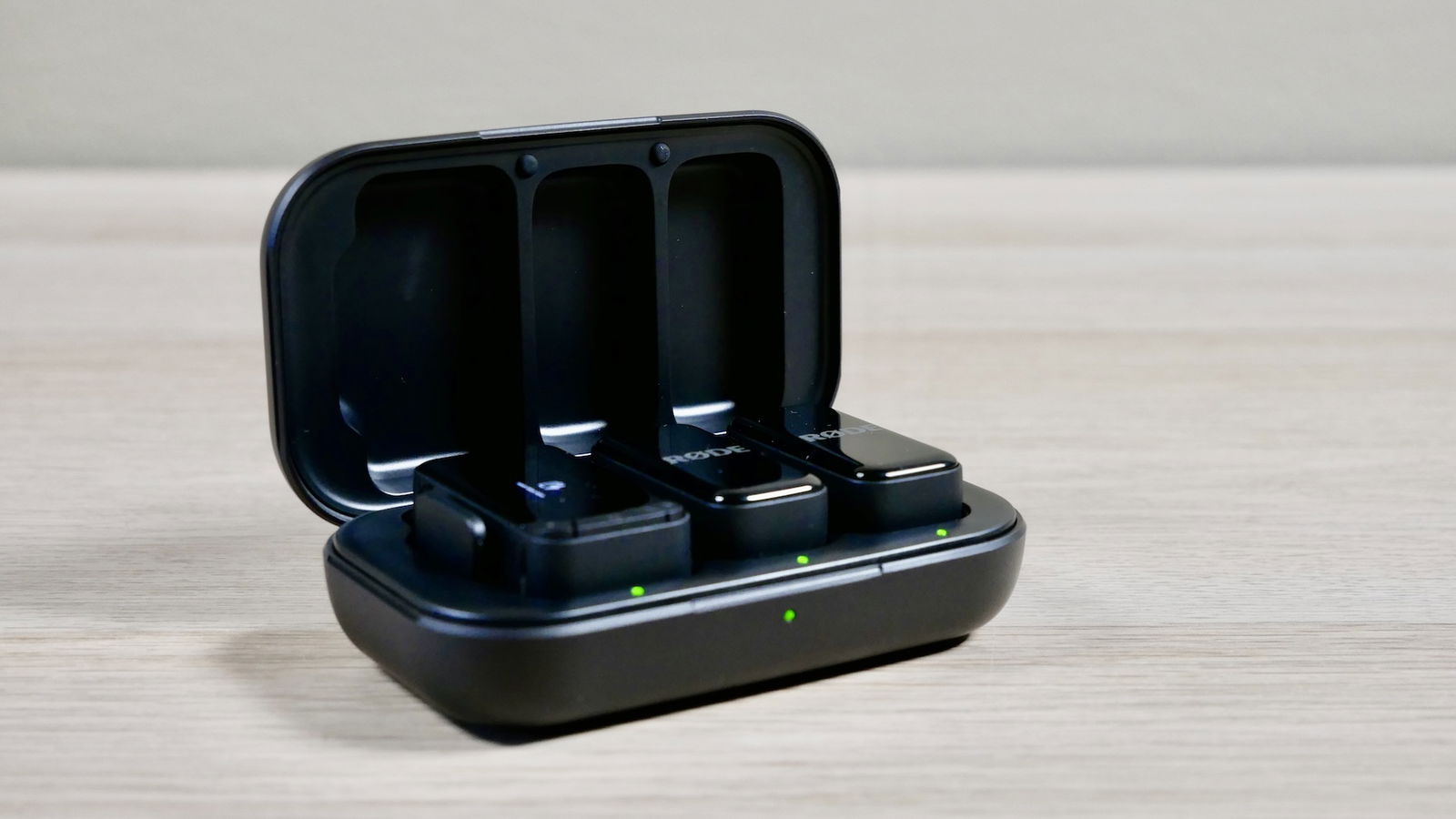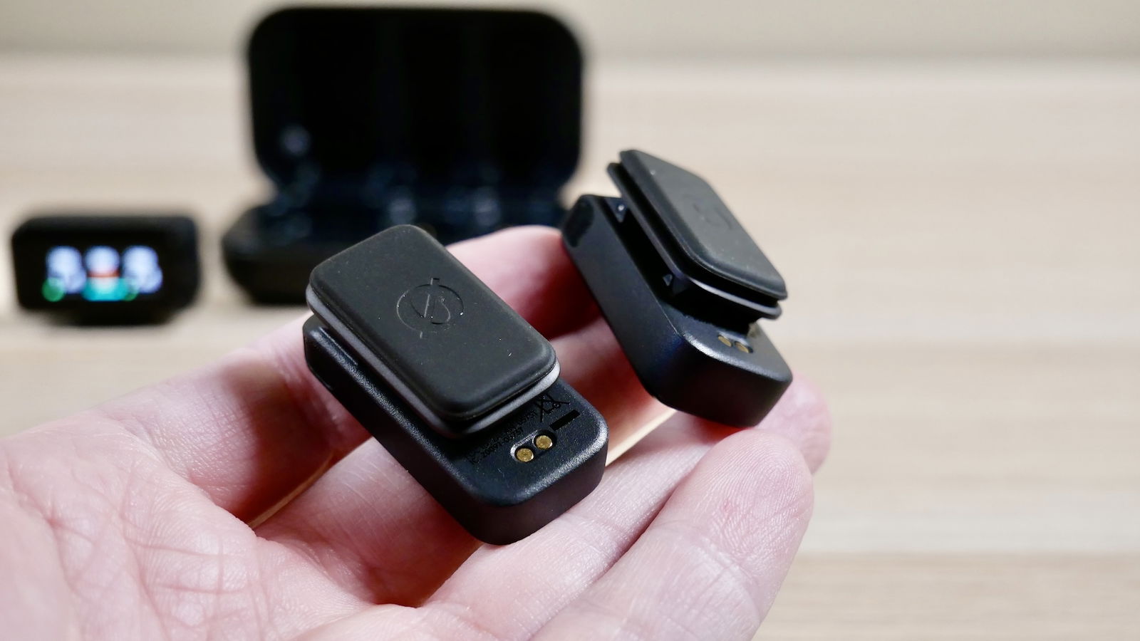 La custodia di ricarica fornita nel kit permette di ricaricare i due trasmettitori per due volte, estendendo l'autonomia totale del sistema a 21 ore. La custodia utilizza una connessione USB-C per la ricarica.