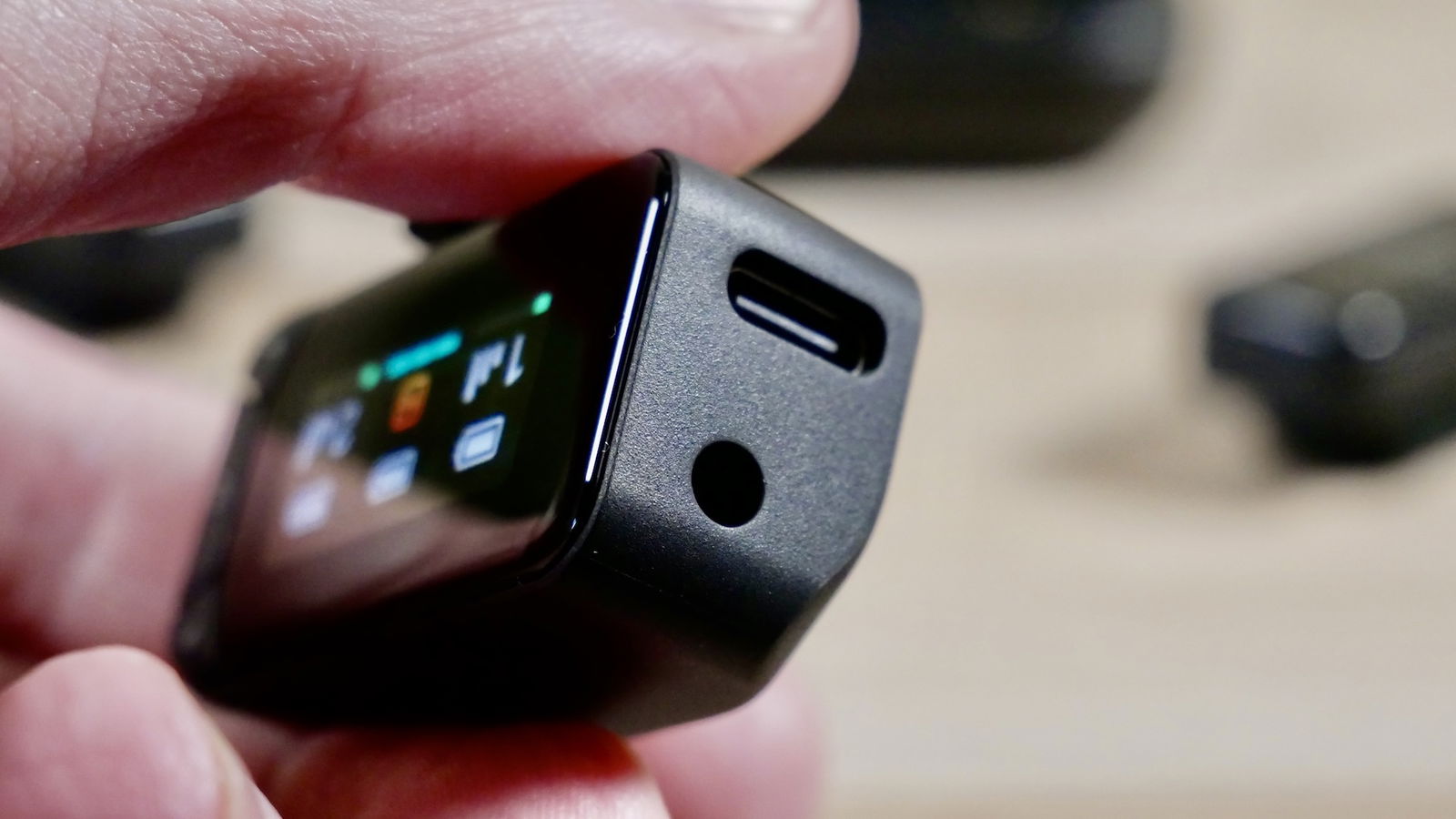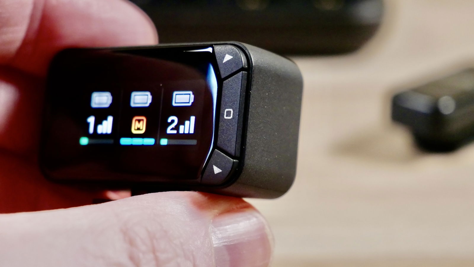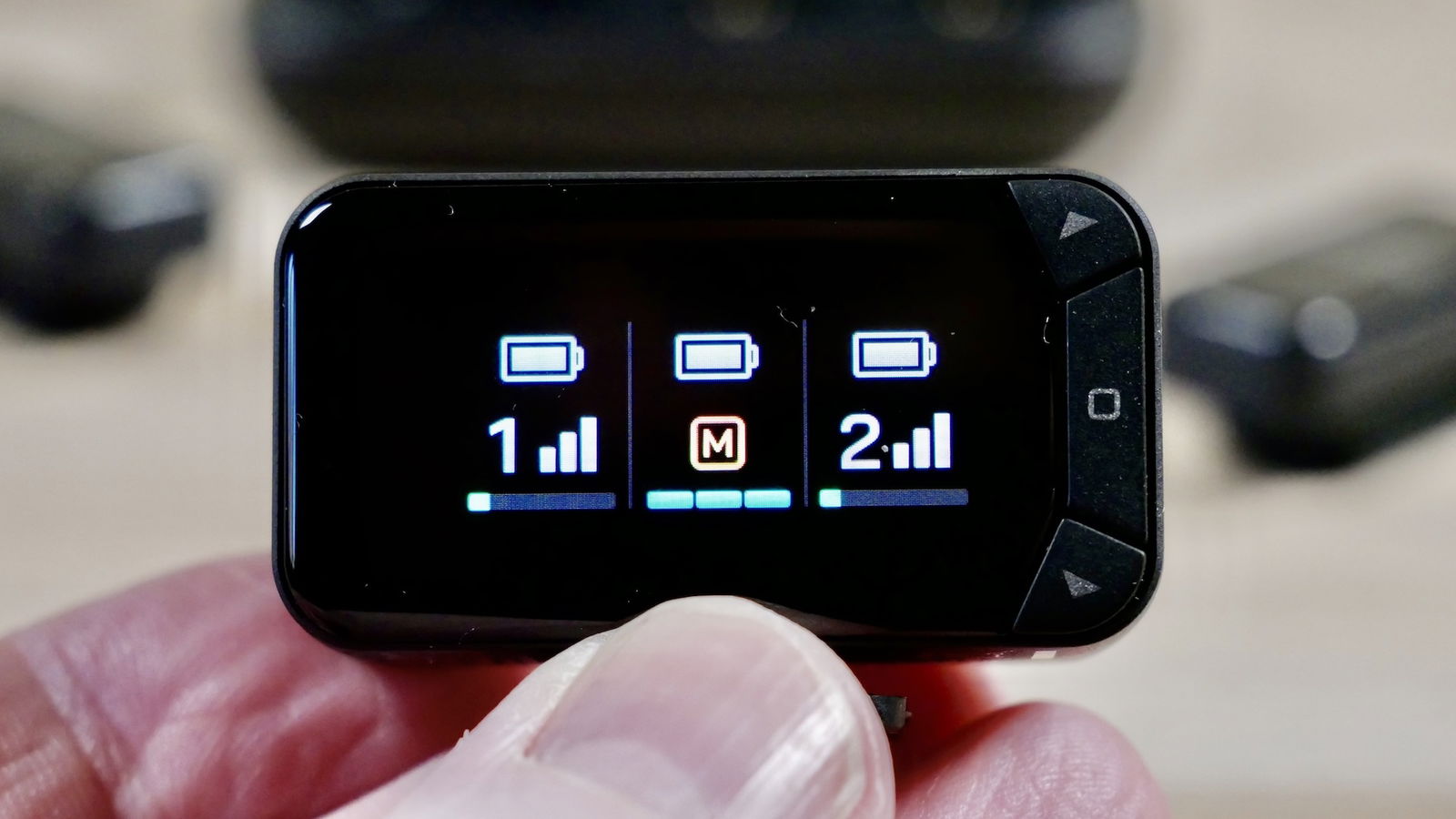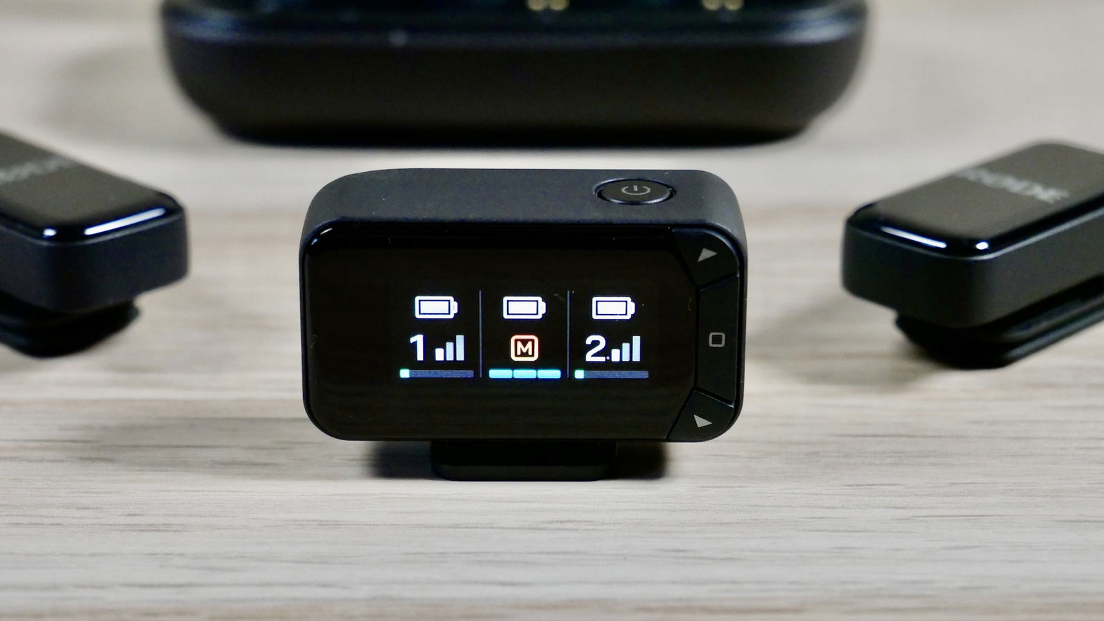 Il ricevitore per fotocamere rappresenta la vera innovazione di questo kit, con dimensioni di 45 x 17 x 28 millimetri e un peso di 20 grammi. Il display AMOLED da 1,1 pollici offre una luminosità sufficiente per la lettura anche in ambienti esterni luminosi, visualizzando in tempo reale lo stato della batteria, i livelli audio di entrambi i trasmettitori, la potenza del segnale wireless e le impostazioni operative correnti.