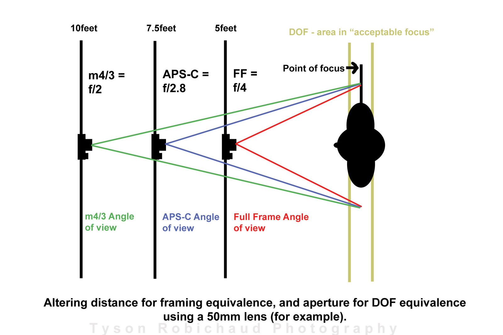 Per poter confrontare facilmente il campo visivo tra fotocamere con sensori di dimensioni diverse, si utilizza il concetto di lunghezza focale equivalente. Questo valore esprime quale lunghezza focale sarebbe necessaria su una fotocamera con sensore standard di riferimento (il "full-frame" o 35mm) per ottenere lo stesso campo visivo. Il calcolo si basa sul "crop factor" (fattore di ritaglio), che è il rapporto tra la dimensione del sensore di riferimento full-frame e la dimensione del sensore in questione. La formula è semplice: