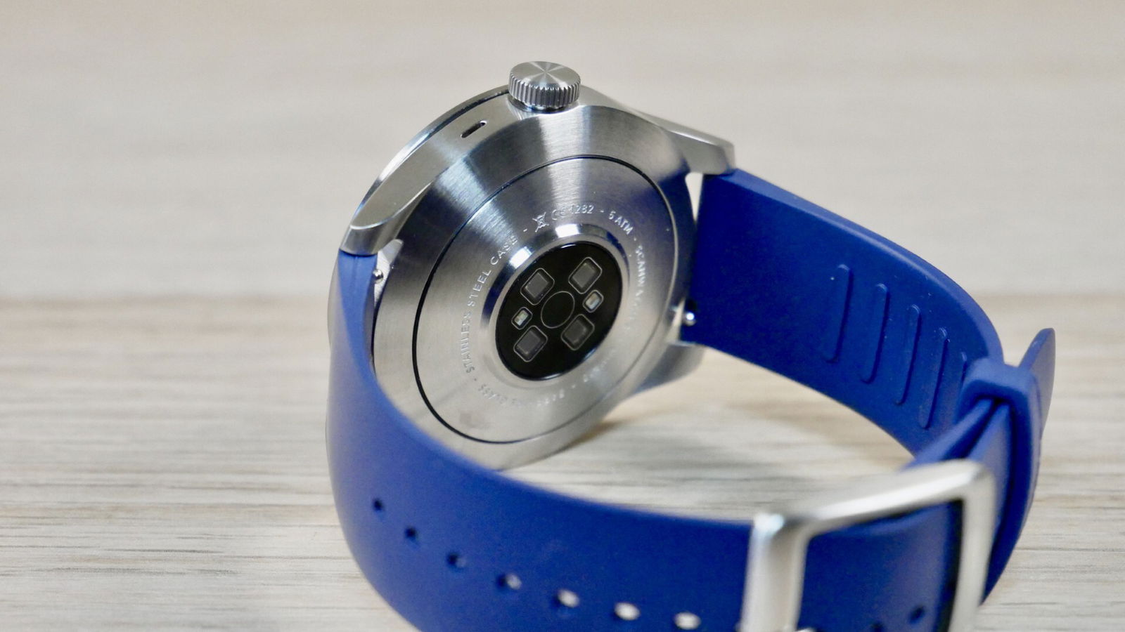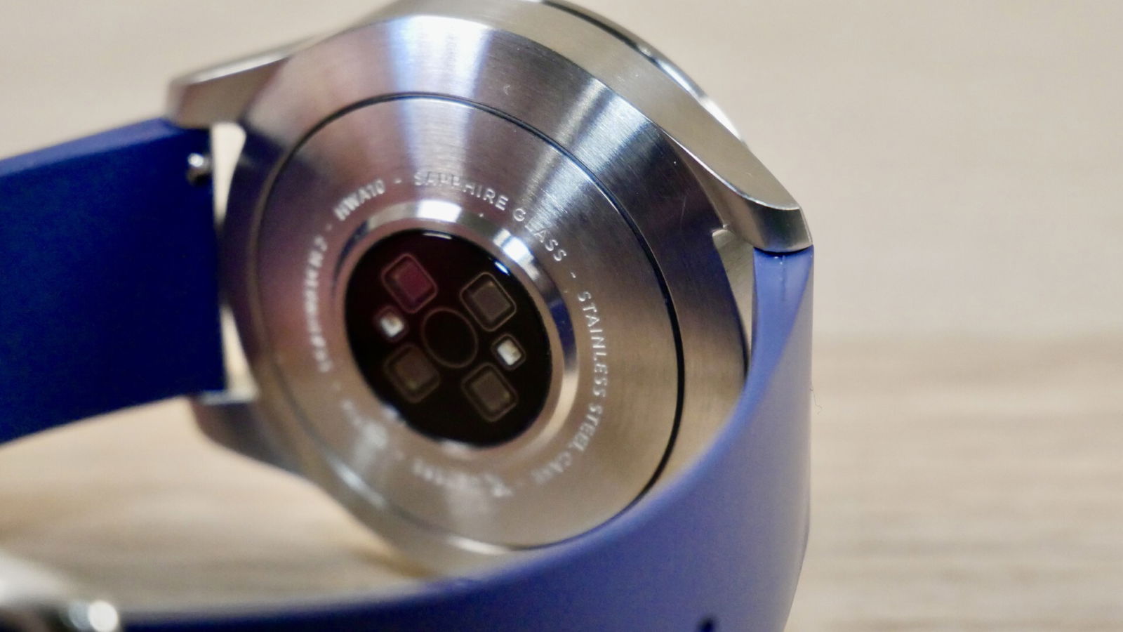 Il quadrante è molto classico, pulito, senza troppi fronzoli. È talmente semplice che si adatterà a tutti gli stili con facilità. La copertura del quadrante è in vetro zaffiro, molto resistente ai graffi. Lo spessore della cassa è contenuto, e al di sotto è incastonato il sensore che attiva la maggior parte delle funzioni, come la misurazione del battito cardiaco.